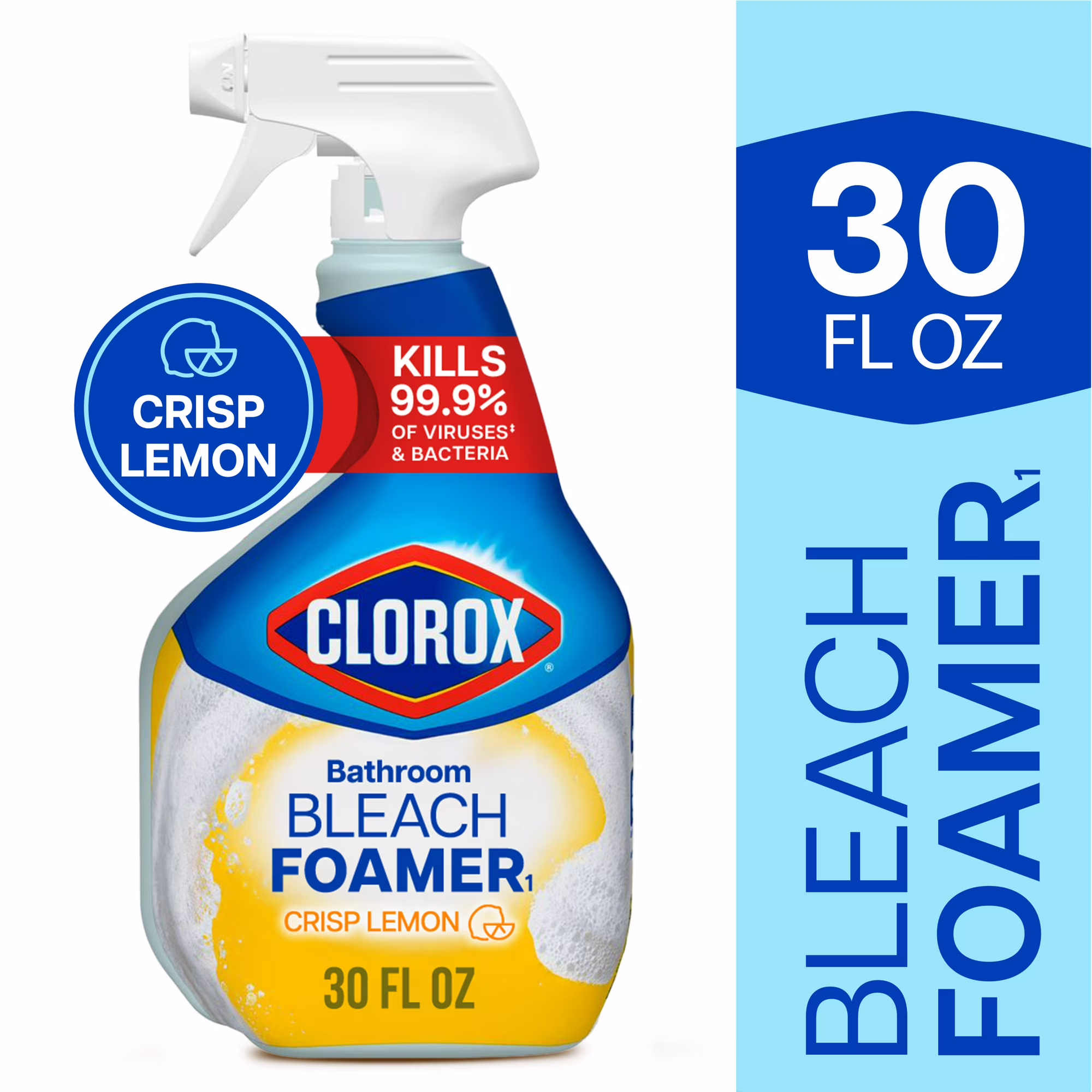 Get the power of Clorox bleach in a penetrating foam formula for a scrub free clean. Clorox Bleach Foamer Bathroom Spray kills mold and mildew and disinfects 99.9% of germs*, leaving your bathroom sparkling clean. Powered by Clorox Bleach, this bathroom foamer cleaner easily cuts through dirt, grime and soap scum. It also removes mold and mildew stains with less scrubbing, so it is perfect for freshening and cleaning tubs, glazed tile, toilets, sinks and counters. This disinfecting spray kills germs commonly found in the bathroom such as staphylococcus aureus (staph), streptococcus pyogenes (strep) and trichophyton mentagrophytes (athletes foot fungus). The Smart Tube technology ensures you spray every stain fighting drop, and the Crisp Lemon scent leaves your bathroom feeling fresh. Behind every sparkling clean bathroom, there is Clorox Bleach Foamer Bathroom Spray. *When used as directed on hard, nonporous surfaces.